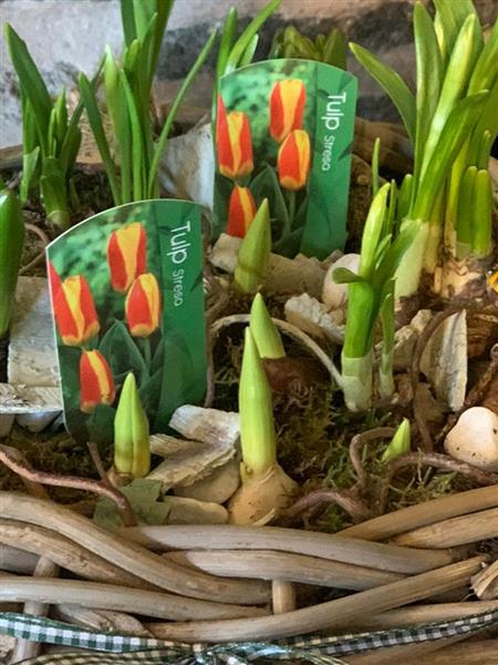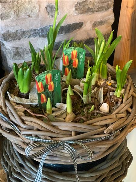 Mix bulbls of tulips, narcisa and hyacinths in beautiful basket.