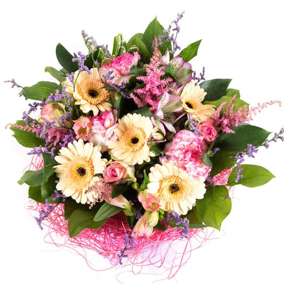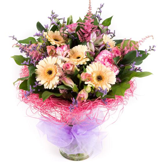 A delightful, compact bouquet of pretty lilac, pink and peach flowers.