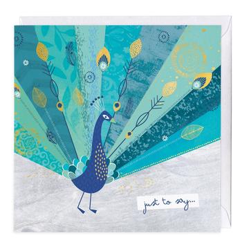 Just To SayÉ Thank you? Congratulations? Thinking of you? Whatever you want to say, this elegant card will help you along. Our stately peacock with his wonderful tail and gold foiled feathers will carry your caring thoughts perfectly. Complete with a pearl envelope and blank inside for your personal message.